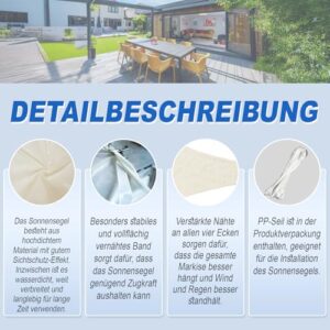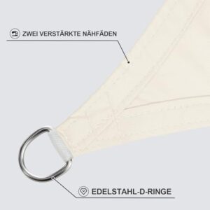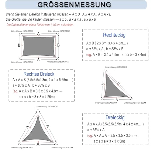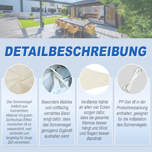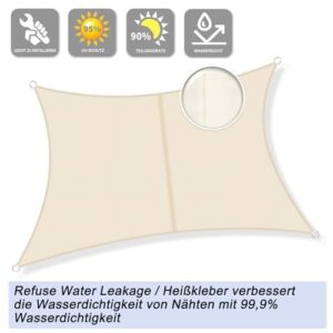 - Material - Sonnensegel aus hochdichtem Polyester. Unsere Sonnensegel haben eine Dichte von 160 g/m², sind leicht und wasserdicht. Sie sind schimmelresistent, schmutzabweisend und farbecht. Eine Reinigung wird nicht empfohlen, da sie die wasserdichte Beschichtung beschädigt.