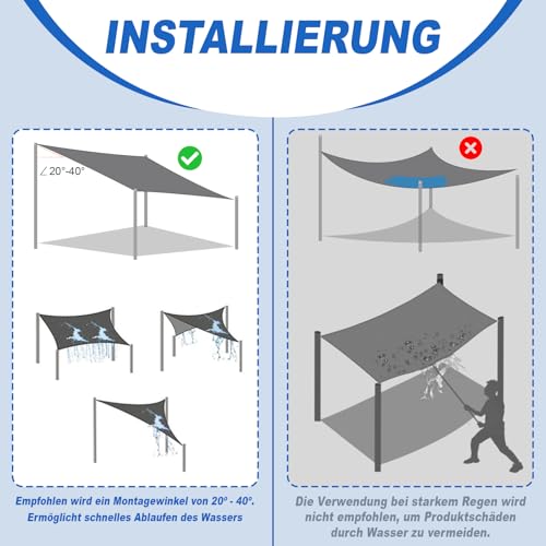 - Wasserdicht - Die wasserdichte Markise hat eine PU-Beschichtung auf der Oberfläche, die kein Wasser in das Produkt eindringen lässt. Es ist wichtig, dass das Sonnensegel eine Neigung hat, der Installationswinkel 20-40 Grad beträgt und die Spannung am größten ist. Es wird nicht empfohlen, es bei Gewittern, starkem Regen, Sturm und Schneetagen zu verwenden.