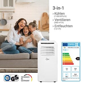 - ❄️ TECHNISCHE DETAILS : 3 in 1 (Kühlen - Entfeuchten - Ventilieren) | Kühlleistung 7.000 BTU /h | 240 Volt | Energieeffizienzklasse: A | Produktabmessungen BxHxT: 31,5 x 69,5 x 31 cm | 19,7 kg | Ein-/Ausschalttimer (1-24 Stunden) | 2 Ventilationsstufen mit max. 280 m3/h Luftumwälzung | Indoor-Nutzung | Manuelle Temperatureinstellung (16-30 °C) | Farbe: weiß | Kabellänge 1,8 m | Schalldruckpegel: 53 dB(A) | Schallleistungspegel: 65 dB(A)