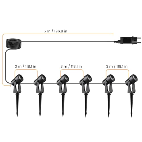 - ☞【20m LED Gartenstrahler 】 5m vom Adapter zum 1. Strahler. 3m lang zwischen den Lichtern, decken Ihren Garten vollständig ab, ideal für eine Reihe von Außenbeleuchtungsanwendungen.