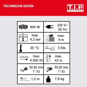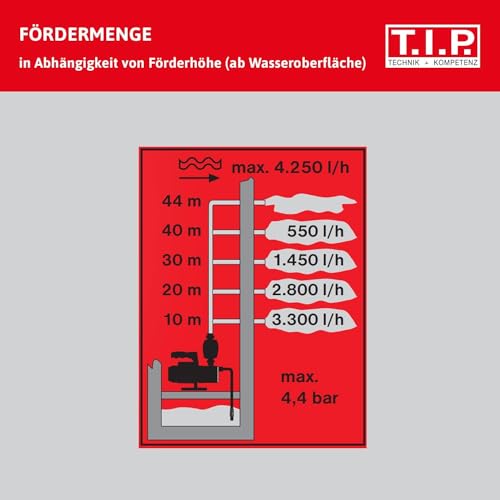 - Hohe Förderleistung: Die T.I.P. Gartenpumpe liefert bis zu 4000 l/h, ideal für die Entleerung von Teichen und Becken oder den Betrieb von drei Beregnern gleichzeitig.