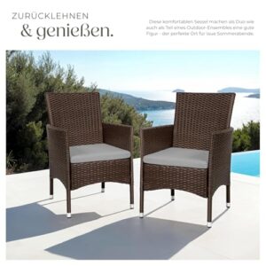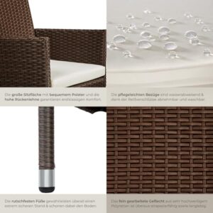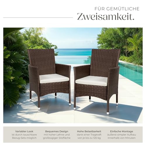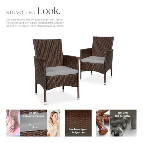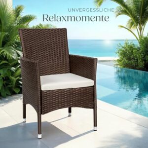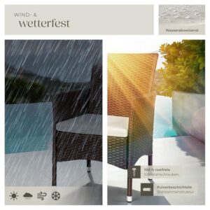 - EINFACHE MONTAGE UND WARTUNG: Mit unserem Polyrattan Gartenmöbel Set wird die Einrichtung zum Kinderspiel. Die einfache Montage der Gartenstühle Rattan ermöglicht es Dir, ohne großen Aufwand einen Hauch von Eleganz in Dein Zuhause zu bringen. Diese Terrassenstühle sind nicht nur ein Blickfang, sondern auch äußerst pflegeleicht, was Dir ermöglicht, mehr Zeit mit Entspannen statt mit Reinigungsarbeiten zu verbringen. Ideal für alle, die Wert auf Komfort, Stil und einfache Pflege legen.