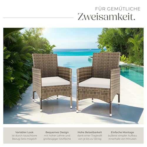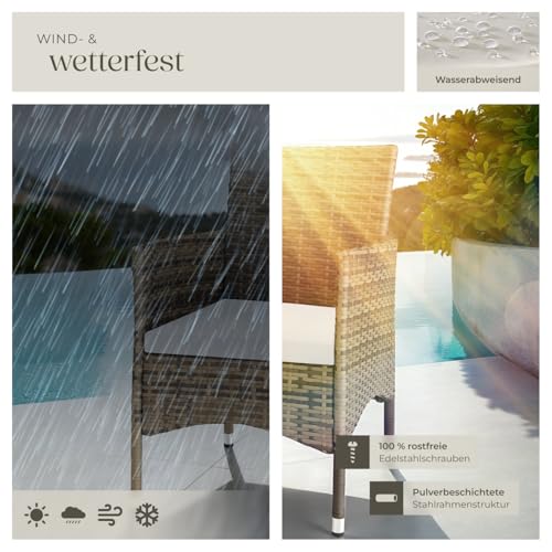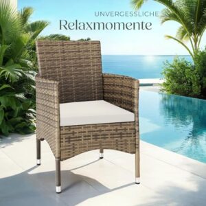 - EINFACHE MONTAGE UND WARTUNG: Mit unserem Polyrattan Gartenmöbel Set wird die Einrichtung zum Kinderspiel. Die einfache Montage der Gartenstühle Rattan ermöglicht es Dir, ohne großen Aufwand einen Hauch von Eleganz in Dein Zuhause zu bringen. Diese Terrassenstühle sind nicht nur ein Blickfang, sondern auch äußerst pflegeleicht, was Dir ermöglicht, mehr Zeit mit Entspannen statt mit Reinigungsarbeiten zu verbringen. Ideal für alle, die Wert auf Komfort, Stil und einfache Pflege legen.