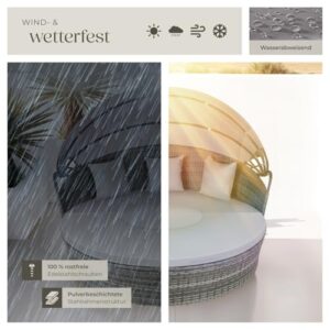 - SITZLOUNGE MIT KOMFORT: Auf den Polsterauflagen lässt es sich perfekt entspannen. Dazugehörige wetterfeste Sitzkissen outdoor verleihen Sitz- und Liegefläche eine stilvolle Note und sorgen für maximalen Komfort! Die imprägnierten Bezüge lassen sich durch den Reißverschluss schnell und unkompliziert abnehmen und reinigen. Ein weiteres Highlight ist das mittlere Element der Relaxinsel : nimmt man das Polster darauf ab, fungiert dieser als kleiner Beistelltisch in Deinem Wellnessbereich.