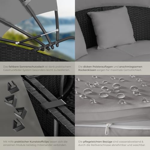 - BALKONLOUNGE MIT SONNENDACH : Der Baldachin der Lounge Insel bietet Schutz vor Hitze und Wind. Egal ob Du Lust auf ein Sonnenbad hast oder lieber ein wenig Schatten willst, mit der Ecklounge outdoor kommst Du auf Deine Kosten! Das funktionale Dach der Rattan Balkonmöbel lässt sich durch ein Gasdruckfedersystem leicht auf- und wieder einklappen, zudem lässt es sich durch Klettverschlüsse ganz einfach fixieren, sodass Du immer die perfekte Liegeposition auf Deiner Relaxliege Garten finden kannst.