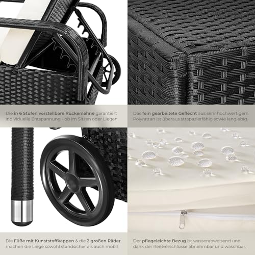 - GEMÜTLICHE POLSTERUNG: Das Gartenbett hat eine weiche Polsterauflage aus Polyester, welche für angenehme Genussmomente sorgt! Unsere Gartenliege Rattan lädt zu entspannten Stunden ein, in denen du ein Buch lesen, schlafen oder die Sonne genießen kannst. Der Polsterbezug ist wasserabweisend und lässt sich für eine hohe Langlebigkeit ganz einfach abnehmen und waschen.