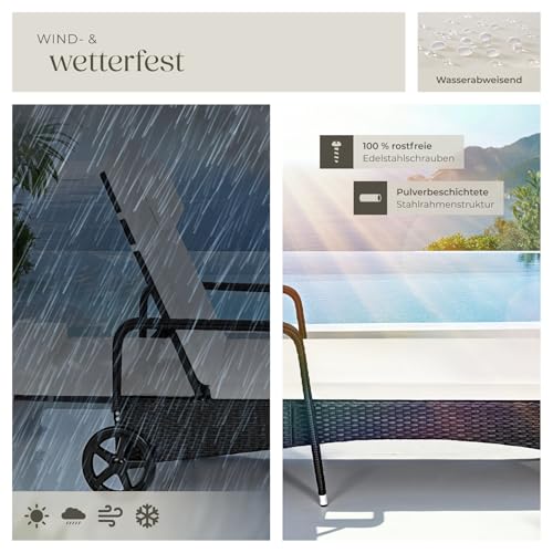 - ROBUSTE MATERIALIEN: Dank des UV-beständigen Polyrattangeflechts ist die Gartenbank wetterfest. Der Sun Lounger besteht aus einem pulverbeschichtetem Stahlgestell, das einen stabilen Stand sowie eine gute Belastbarkeit gewährleistet. Sorgfältige Verarbeitung und eine hohe Qualität – das zeichnet unseren Liegestuhl Balkon aus.