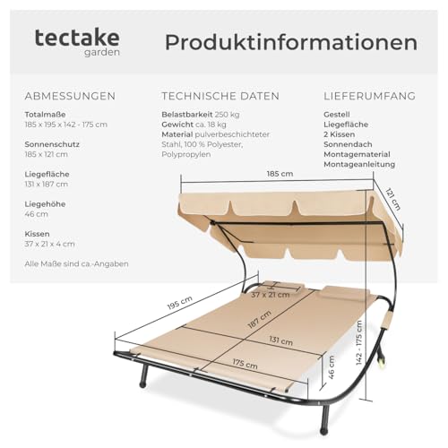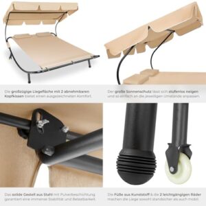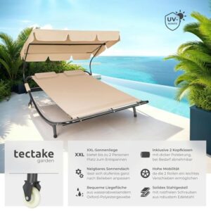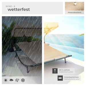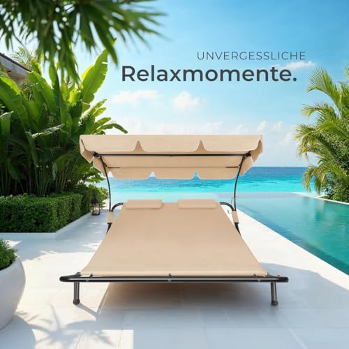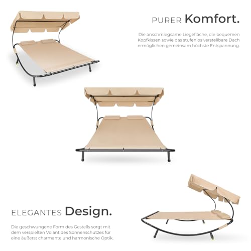 - GEMEINSAME ENTSPANNUNG: Ob mit Deinem Lieblingsmenschen oder alleine – mit einer Belastbarkeit von bis zu 250 kg lädt die Gartenliege mit Sonnendach zum gemeinsamen Relaxen ein. Ein Getränk in der Hand, die Sonne im Gesicht und Dein bester Freund an der Seite – besser geht's nicht!