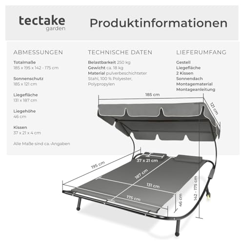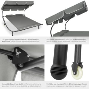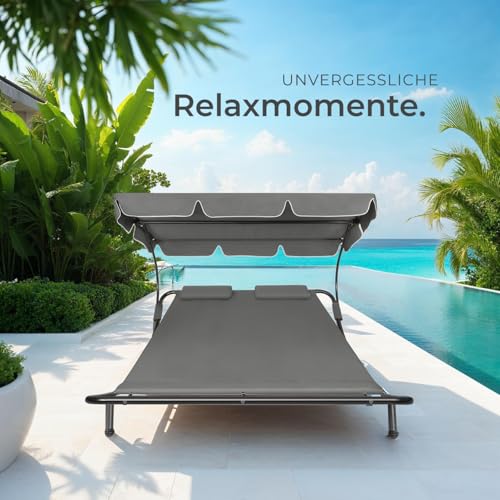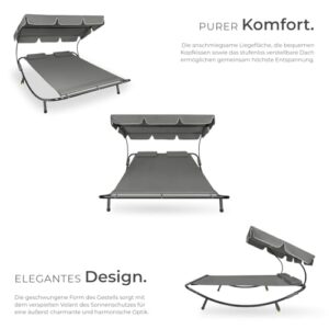 - GEMEINSAME ENTSPANNUNG: Ob mit Deinem Lieblingsmenschen oder alleine – mit einer Belastbarkeit von bis zu 250 kg lädt die Gartenliege mit Sonnendach zum gemeinsamen Relaxen ein. Ein Getränk in der Hand, die Sonne im Gesicht und Dein bester Freund an der Seite – besser geht's nicht!