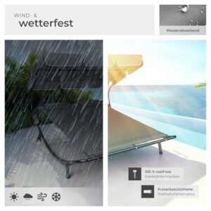 - PFLEGELEICHT & ROBUST: Unsere Relaxliege kommt mit pflegeleichten Textilbezügen, dank einer flüssigkeitsabweisenden Beschichtung. Regen auf Deinem Balkon? Kein Problem! Das robuste Metallgestell sorgt dafür, dass die Gartenliege wetterfest ist und lange hält. So kannst Du sie als dauerhafte Outdoor Möbel nutzen.