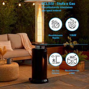 - Sofortige Heizung: Eclissi verfügt über eine Heizleistung von 13 kW und sorgt für eine schnelle und gleichmäßige Erwärmung für Außenbereiche bis zu 75 m², verteilt die erzeugte Wärme rund und um 360 °.