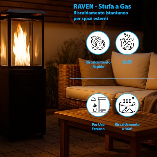 - RAVEN KOMPLETTSET: Der Gasheizstrahler Raven beinhaltet umfangreiches Zubehör für den sofortigen Einsatz: zertifizierter Druckregler und Gasschlauch, PE-Schutzhülle, Regen- und Staubschutz, Zierholz und Lavastein.