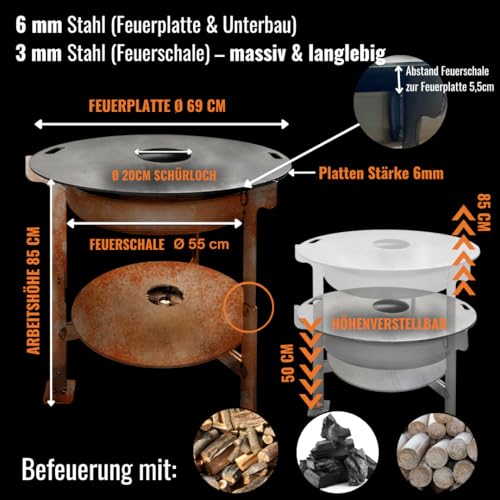 - 🔥 𝟮-𝗶𝗻-𝟭 𝗙𝗲𝘂𝗲𝗿𝘀𝗰𝗵𝗮𝗹𝗲 & 𝗙𝗲𝘂𝗲𝗿𝗽𝗹𝗮𝘁𝘁𝗲 – Lagerfeuer-Romantik und BBQ-Genuss in einem! Die perfekte Kombination aus Feuerschale und Grillplatte für gesellige Abende im Garten oder auf der Terrasse. Passendes Zubehör finden Sie in den Variationen.