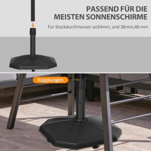 - **Witterungsbeständigkeit und Langlebigkeit**: Das robuste Kunststoffgehäuse und der pulverbeschichtete Masteinsatz aus Metall sorgen dafür, dass der Schirmständer jahrelang im Freien eingesetzt werden kann, ohne seine Funktion oder sein Aussehen zu verlieren.