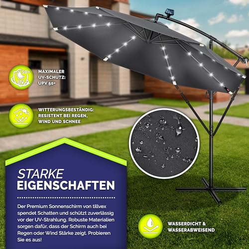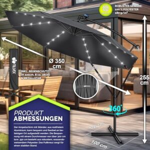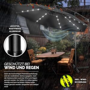 - STIMMUNGSVOLLE LICHTER: Großer Sonnenschirm mit 32 LED-Lampen (gemütliches warmes Licht) und Ø 350 cm für einen großflächigen Schatten. Das leistungsstarke Solarpanel sorgt für ausreichenden Strom. Die Steuerung erfolgt mittels An-/Ausschalter.