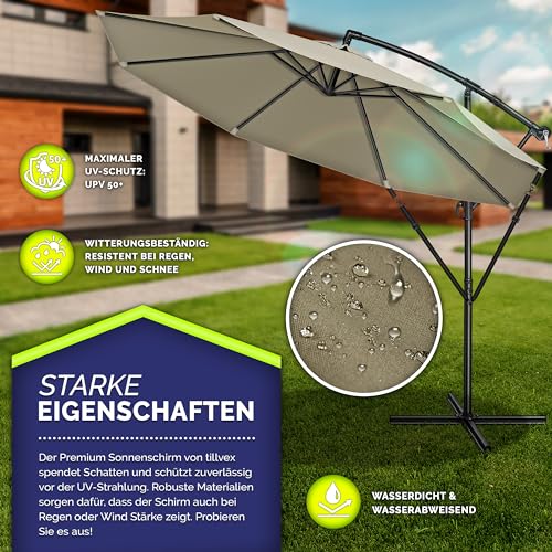 - EINFACHE HANDHABUNG: Die Handhabung beim tillvex Garten-Schirm ist äußerst komfortabel. Der Auf- und Abbau lässt sich dank spezieller Falttechnik in wenigen Sekunden erledigen. Bei Nichtgebrauch können Sie den Schirm per Hand-Kurbel schließen und platzsparend verstauen.
