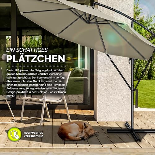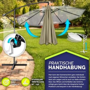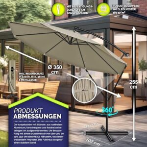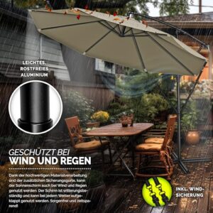 - EINFACH ZU VERSTELLEN: Dieser Ampelschirm aus rostfreiem Aluminium bietet maximale Flexibilität durch seine 360° Drehbarkeit. Dadurch kann der Schirm leicht in verschiedene Richtungen ausgerichtet werden, um den Schattenbedarf je nach Tageszeit und Sonnenstand zu erfüllen. Der Sonnenschirm ist mit einer zusätzlichen Windsicherung ausgestattet. Diese intelligente Windsicherung gewährleistet eine besonders stabile Nutzung des Alu Ampelschirms, selbst bei windigen Bedingungen.