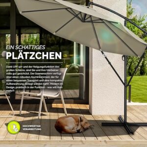 - HOHER UV-Schutz: Das Schirmtuch bei diesem Kurbelschirm besteht aus robustem 180 g/m² Polyester bietet nicht nur eine erstklassige Haltbarkeit, sondern gewährleistet auch einen effektiven UV-Schutz bis UPF 50+. Mit einem großzügigen Durchmesser von 350 cm spendet der Marktschirm einen großflächigen Schatten, der bis zu 98 % der schädlichen UV-Strahlen abhält.