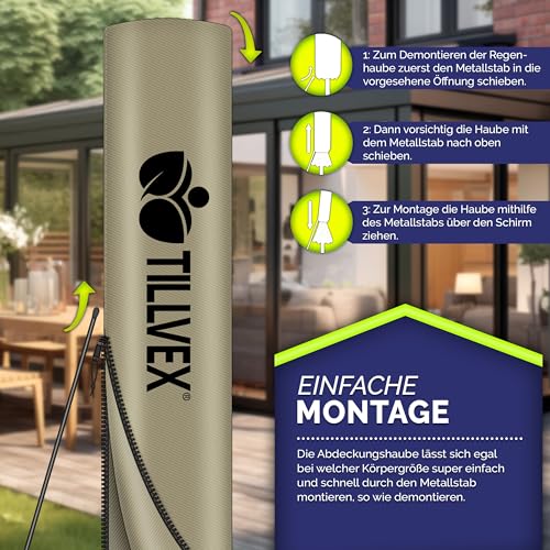 - IDEALER SCHATTENSPENDER: Der tillvex Sonnenschirm wird mit einer hochwertigen, wasserdichten Abdeckung geliefert, die sich mühelos mit einem Reißverschluss montieren und demontieren lässt. Die praktische Zugabe eines Metallstabs erleichtert den Vorgang zusätzlich, indem er die Montage und Demontage der Abdeckung besonders einfach macht.