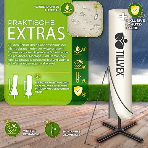- IDEALER SCHATTENSPENDER: Der tillvex Ampelschirm rechteckig 330 cm bietet großzügigen Schatten für Terrasse, Balkon oder Garten. Die mitgelieferte, wasserdichte Abdeckung lässt sich mühelos per Reißverschluss anbringen und entfernen. Dank des Metallstabs gelingt die Montage besonders einfach und komfortabel.