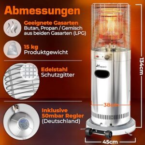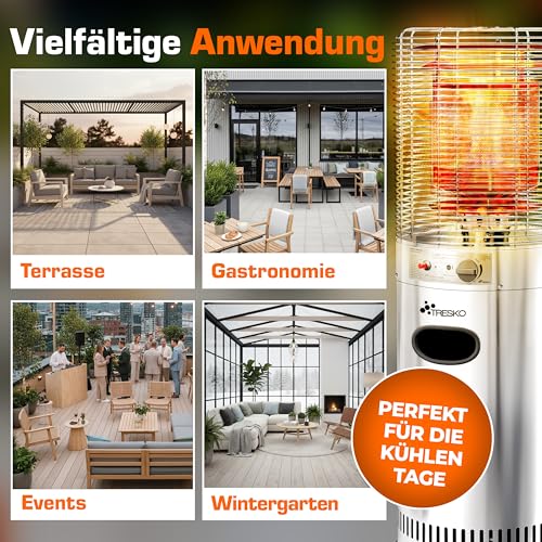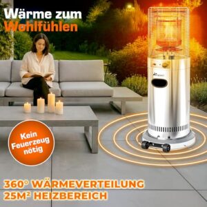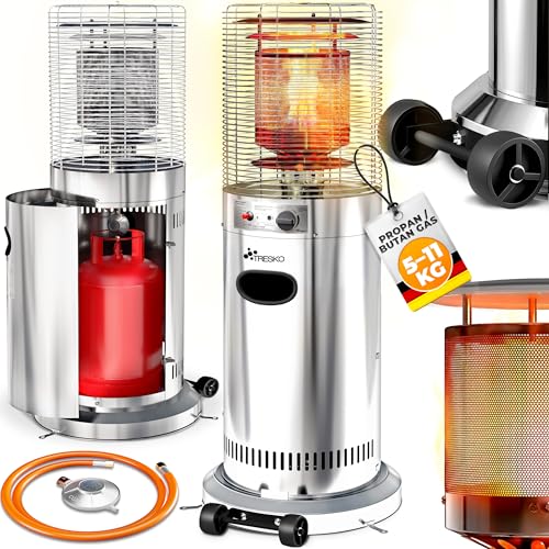 - 360° WÄRME & FLEXIBLE GASNUTZUNG: Der TRESKO Terrassenheizstrahler liefert schnelle 360°-Wärme für Terrasse, Balkon, Garten, Biergarten, Camping oder Partyzelt. Als Gasheizung geeignet für Propan, Butan und LPG-Gemische sorgt das Heizgerät mit stufenlos regelbaren 5.000–11.000 W für angenehme Temperaturen auf bis zu 25 m². Perfekt als Freiluftheizung im Außenbereich – ideal für Restaurant-Terrassen oder gemütliche Winterabende.