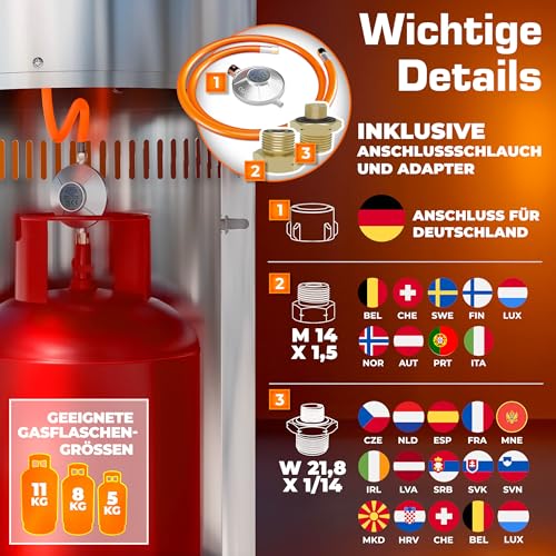 - INKLUSIVE GASSCHLAUCH & DRUCKMINDERER: Der Terrassenheizer wird mit Druckregler, Gasschlauch und zwei internationalen Adaptern geliefert – kompatibel mit vielen Anschlüssen in der EU. Dadurch lässt sich der Gasstrahler auch in Ferienhäusern, beim Camping oder in Restaurants sicher betreiben. Der TRESKO Outdoor-Heizstrahler kombiniert starke Leistung, hohe Sicherheit und universelle Einsatzmöglichkeiten.