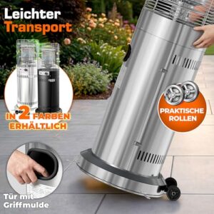 - MOBIL & KOMPAKT – LEICHT ZU BEWEGEN: Mit integrierten Transportrollen und einer Griffmulde lässt sich der Terrassenstrahler selbst mit einer vollgepackten Gasflasche (5–11 kg) mühelos bewegen. Durch das kompakte Design passt das Gasheizgerät auch auf kleinere Terrassen oder Balkone. Ideal für flexible Nutzung im Garten, beim Camping oder im Gastro-Bereich.