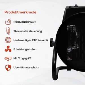- Dank seiner kompakten Form ist der Heizer flexibel einsetzbar. Der Tragegriff erleichtert den Transport, während der schwenkbare Standfuß eine gezielte Ausrichtung der Warmluft erlaubt. Der Betrieb erfolgt frei platzierbar und ohne feste Installation, wodurch das Gerät in Wohnräumen, Werkstätten, Garagen oder auf Baustellen problemlos nutzbar ist.