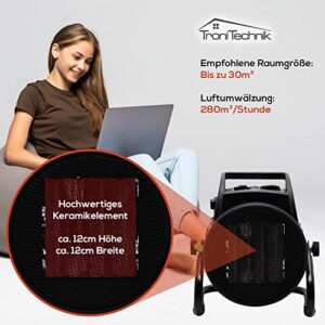 - Der TroniTechnik Keramikheizer TT-KH-503 mit den Maßen 27 x 21 x 29 cm eignet sich für den mobilen Einsatz im Innen- und Außenbereich. Zwei Heizstufen (1500/3000 Watt) und die stufenlose Thermostatsteuerung bieten flexible Einsatzmöglichkeiten. Das PTC-Keramikelement erwärmt Räume bis 30 m² effizient - kompakt, geruchslos und ohne Vorlaufzeit sofort betriebsbereit.
