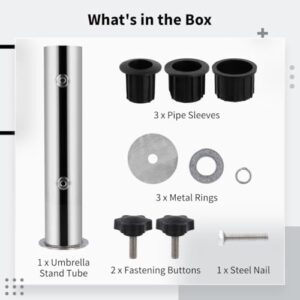 - 【Alle Teile enthalten für eine einfache Einrichtung】 Dieser Schirmständer für den Außenbereich verfügt über ein komplettes Set für eine schnelle Installation. Es enthält ein Schirmständerrohr, drei Rohrhülsen, einen Stahlnagel, drei Metallringe und zwei Befestigungsknöpfe. Schrauben Sie einfach die Basis, wählen Sie eine Hülse, schieben Sie die Stange ein und ziehen Sie sie für einen stabilen und sicheren Sitz fest. Perfekt für Ihre Terrasse, Ihren Garten oder Ihren Hinterhof.
