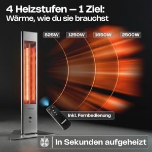- WÄRMESPENDER MIT 4 STUFEN: Infrarot-Heizstrahler mit 825 – 2500 Watt Leistung. Als Terrassenheizer & Infrarotstrahler sorgt der Terrassenstrahler elektrisch outdoor für wohltuende Wärme im Außenbereich. Infrarotheizung Standgerät inkl. Fernbedienung.