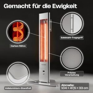 - FESTER STAND: Hochwertiges Gehäuse & Standfuß aus Vollaluminium für einen sicheren Halt. Der Terrassen Heizstrahler und Infrared heater trotzt Sturm & Regen. Egal ob als alternativer Heizpilz elektrisch außen oder als Infrarotstrahler Terrasse – Der Heater hält dich warm.
