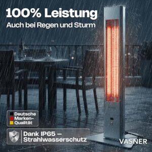 - SICHER VOR STURM UND REGEN: Dank IP65 Strahlwasserschutz ist der Terrassenheizstrahler dauerhaft im Freien nutzbar. Der Infrarot Strahler Outdoor dient als zuverlässige Terrassenheizung & Heizstrahler Balkon. Auch bei Regen & Wind ist der Terrassenheizer elektrisch voll funktionsfähig.