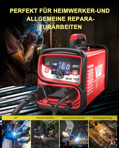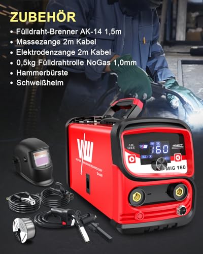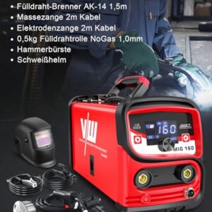 - 【Komplettes Set】: Dieses MIG-Schweißgerät 160 ist komplett ausgestattet mit allem, was Sie brauchen, einschließlich 1x MIG 160 Kombi-Schweißgerät. 1x Fülldraht-Brenner (AK-14) mit 1,5m Kabel. 1x Massezange mit 2m Kabel. 1x Elektrodenhalter mit 2m Kabel. 1x Fülldrahtrolle NoGas 1,0mm (0,5kg). 1x Bedienungsanleitung. 1 x Schweißerhelme.1x Bürste, idealen Fülldraht Schweissgerät Set für Anfänger und Profis macht.