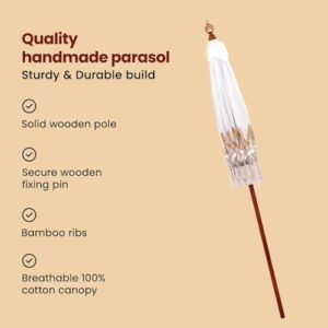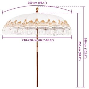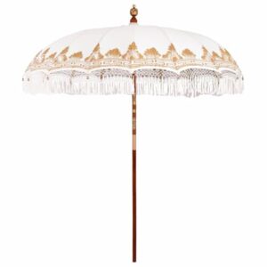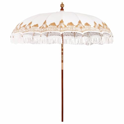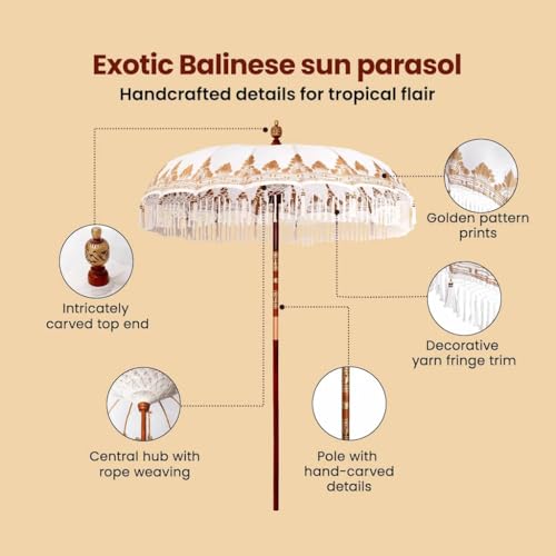 - 【Elegantes balinesisches Design】 Der balinesische Sonnenschirm bringt die entspannte Schönheit der balinesischen Kultur nach draußen. Mit einem stabilen, handgefertigten Holzgestänge und einem schützenden Baumwoll-Dach ist er ideal für Terrassen und Gärten. Die sanften Farben und tropischen Elemente sorgen für einen chilligen Rückzugsort im Sommer. Schlagworte: Balinesischer Sonnenschirm, Außenschirm, Patio-Schatten.