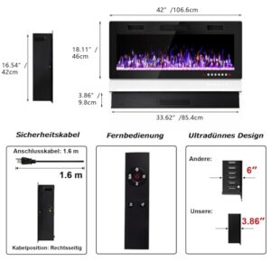 - 【42-Zoll Elektrokamin】Kein Feuer, keine Verbrennungsgefahr – somit ungefährlich für Kinder und Haustiere. Dank integriertem Überhitzungsschutz wird eine kritische Wärmeentwicklung vermieden. Gesamtmaß: 106,6 cm (L) × 9,8 cm (D) × 46,0 cm (H), Einfügemaß: 85,4 cm (L) × 42,0 cm (H). Perfekt für Wohnzimmer, Schlafzimmer, Speiseraum, Hotellobby oder überall dort, wo Zusatzwärme und Ambiente gewünscht ist.