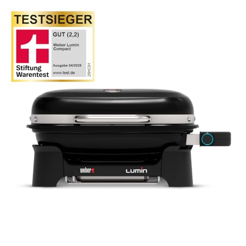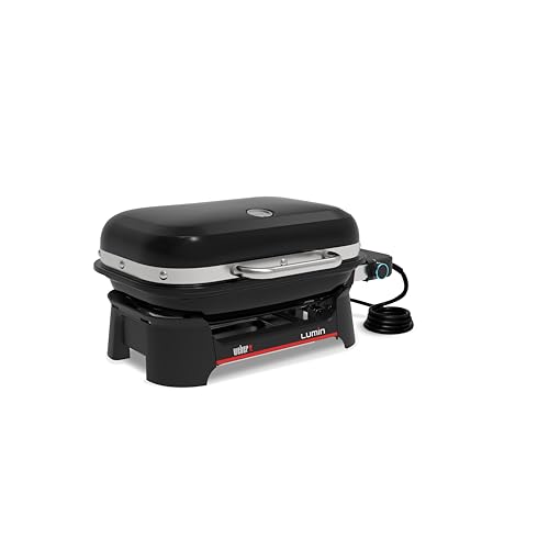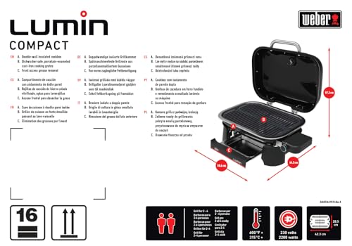 Weber Lumin Compact Tragbarer Kompakter Elektrogrill, Bis zu 315 °C, mit Deckelthermometer, Porzellanemaillierte Gusseisenroste, 43 x 32 cm Grillfläche, Schwarz (1502044)