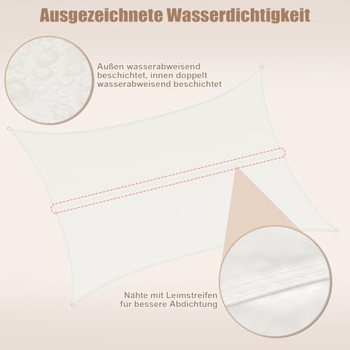 - 🍧𝐖𝐀𝐒𝐒𝐄𝐑𝐅𝐄𝐒𝐓 𝐔𝐍𝐃 𝐒𝐎𝐍𝐍𝐄𝐍𝐃𝐈𝐂𝐇𝐓: Das Sonnensegel ist innen mit PU beschichtet. Seine Nahtstelle ist mit wasserdichtem Streifen versehen, um die Wasserundurchlässigkeit zu verbessern. Es bietet zudem einen UV-Schutz von 95 % und schafft so Ihnen einen natürlichen, kühlen und gemütlichen Raum