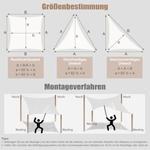 - 🍧𝐄𝐈𝐍𝐅𝐀𝐂𝐇𝐄 𝐌𝐎𝐍𝐓𝐀𝐆𝐄: Mit den mitgelieferten PE-Seilen und den starken D-förmigen Edelstahlringen an jeder Ecke lässt sich das Sonnensegel einfach aufspannen und an einem Gebäude, Ast oder Pfosten befestigen. Der Aufbau dauert nur wenige Minuten und ist auch von einer Person leicht zu bewerkstelligen