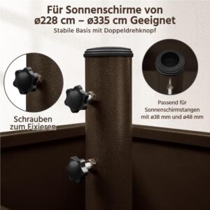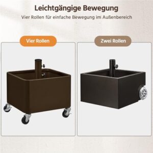 - Sonnenschirmgewicht auf Rollen: Dieser Terrassenschirmständer ist mit vier Rollen ausgestattet, die eine einfache Mobilität ermöglichen. Zwei feststellbare Räder sorgen dafür, dass der Ständer nach dem Positionieren stabil bleibt