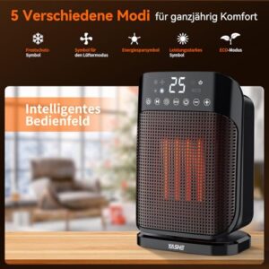 - Tragbares und praktisches Design: Mit einem tragbaren Griff, mehreren Heizmodi (1800W hohe Hitze, 900W energiesparende Hitze, ECO, Ventilator), einem 24-Stunden-Timer, einer Fernbedienung, einer Kindersicherung und einer Speicherfunktion passt sich dieser Heizlüfter perfekt Ihrem Lebensstil an. Ob im Wohnzimmer, Badezimmer, Schlafzimmer oder Büro – er bietet jederzeit Komfort und Wärme.