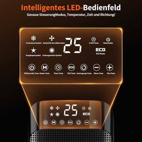 - Intelligente Temperaturregelung: Stellen Sie die Temperatur in 1°C-Schritten von 10°C bis 35°C präzise ein, um den perfekten Komfort zu gewährleisten. Der verbesserte NTC-Chip und Thermostat bieten personalisierte Heizoptionen, während der ECO-Modus automatisch für optimale Energieeffizienz sorgt. Der verbesserte 75°-Oszillationsmodus erweitert die Wärmeabdeckung und sorgt für angenehme Behaglichkeit.