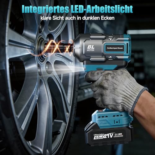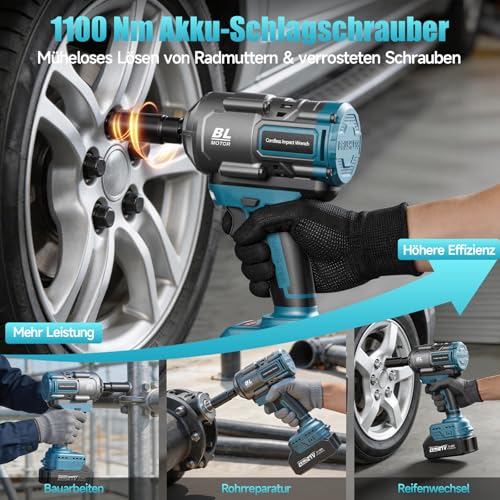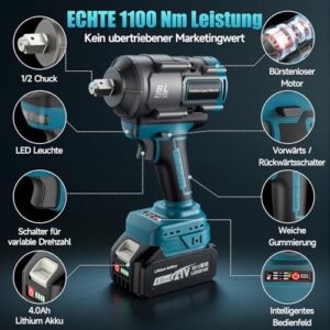 - 🔧 【1100 Nm Akku-Schlagschrauber – Hohes Drehmoment】- Der Yofuly Akku-Schlagschrauber liefert ein maximales Drehmoment von bis zu 1100 Nm (811 ft-lbs) und ist stark genug, um Radmuttern, rostige Schrauben oder festsitzende Bolzen am Fahrzeug schnell zu lösen. Ideal für Reifenwechsel, Autoreparaturen, Baustellenarbeiten oder Maschinenmontage – kraftvoll, effizient und kabellos.