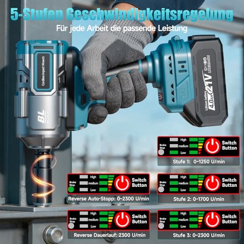 - 💡 【5 Geschwindigkeitsstufen für präzise Kontrolle】- 3 Vorwärtsstufen (0–1250 / 0–1700 / 0–2300 U/min) sowie Rückwärtslauf mit Dauerbetrieb und Auto-Stopp (0–2300 U/min). Ideal für präzises Schrauben oder kraftvolles Lösen von Radmuttern, Stahlverschraubungen und Maschinen. Integriertes LED-Arbeitslicht für klare Sicht in Garage, Werkstatt oder auf der Baustelle.