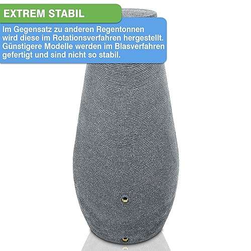- PREMIUM QUALITÄT DURCH ROTATIONSVERFAHREN - Dieses Fass ist extrem stabil, da diese im Vergleich zu anderen Regentonnen nicht im Blasverfahren sondern im Rotationsverfahren hergestellt wird. Die Wände lassen sich somit nicht eindrücken und ist somit Bruch- und Schlagfest. Das Eigengewicht beläuft sich auf 16 kg und sorgt für einen extrem stabilen Stand, auch wenn der Wasserspeicher leer ist.