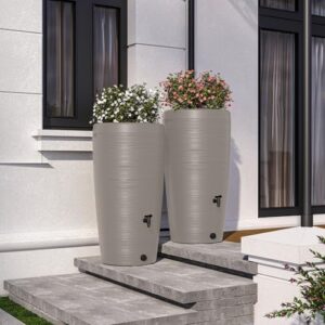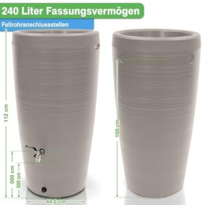 - MODERNES DESIGN - Mit seiner beeindruckenden Oberflächenstruktur, wird dieser Regenwasserbehälter zum stilvollen Highlight und verleiht Ihrem Garten eine besondere Eleganz. Wassertank im mit unglaublichen 240 Liter Fassungsvermögen. Wassertonne ist schmal: ist für die Größe relativ schmal gehalten und spart somit Platz aber sieht modern aus. Durchmesser unten: 44,5cm, Durchmesser oben: 59,5 cm, Höhe: 112 cm