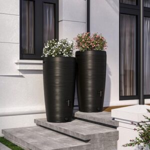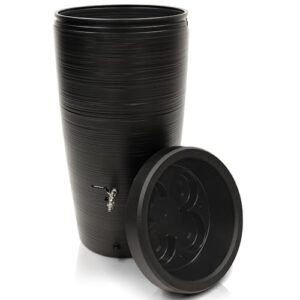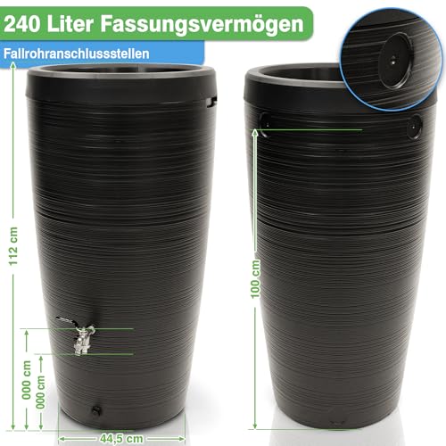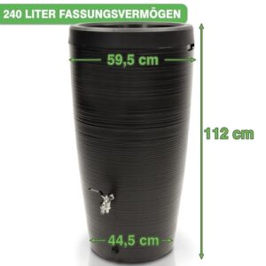 - MODERNES DESIGN - Mit seiner beeindruckenden Oberflächenstruktur, wird dieser Regenwasserbehälter zum stilvollen Highlight und verleiht Ihrem Garten eine besondere Eleganz. Wassertank im mit unglaublichen 240 Liter Fassungsvermögen. Wassertonne ist schmal: ist für die Größe relativ schmal gehalten und spart somit Platz aber sieht modern aus. Durchmesser unten: 44,5cm, Durchmesser oben: 59,5 cm, Höhe: 112 cm