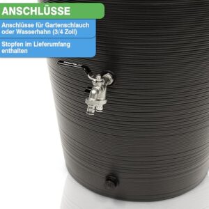 - NACHHALTIGE BEWÄSSERUNG - Nutzen Sie die natürliche Ressource Regenwasser, um Ihren Garten zu bewässern und einen Beitrag zur Reduzierung Ihres ökologischen Fußabdrucks zu leisten. Hergestellt aus UV-beständigem Recyclingkunststoff, widersteht das Fass den Elementen und bleibt lange Zeit schön und funktional. Made in Europe!