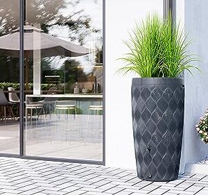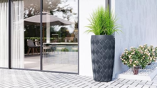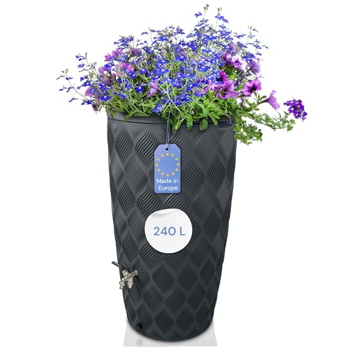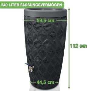 - DESIGN-HIGHLIGHT - Mit einem traumhaften Oberflächenstruktur, das wie Kunstwerke die Blicke auf sich zieht, wird dieser Regenwasserbehälter zu einem Eye Catcher, der die Schönheit Ihres Gartens auf ein neues Niveau hebt. Wassertank im mit unglaublichen 240 Liter Fassungsvermögen. Regentonne schmal: Wasserfass ist für die Größe relativ schmal gehalten und spart somit Platz aber sieht modern aus. Durchmesser unten: 44,5cm, Durchmesser oben: 59,5 cm, Höhe: 112 cm