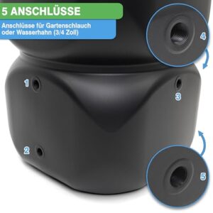 - PRAKTISCHE ANSCHLÜSSE - Regenfass besitzt 5 Gewindebohrungen für Wasserhahn oder Schnellverschlusskupplung (3/4 Zoll). Verschlussstopfen weren mitgeleifert. Die unteren Anschlüsse sind ideal zum Entleeren des Wasserbehälters oder zum Anschließen von Wasserschläuchen oder zum verbinden von weiteren Regentonnen. Zudem gibt es oben eine Fallrohranschlussstelle. Die Regentonne besitzt eine Öffnung mit Deckel (20cm Durchmesser).